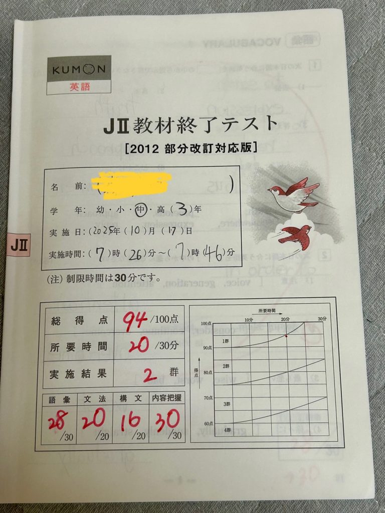 息子さん、公文英語の終了テストを受けて合格しました。