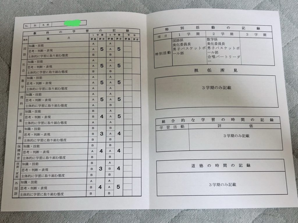 通知表の結果はこんな感じです。提出物をきちんと出さないから、主体的に取り組む欄はイマイチですね。